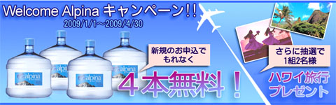 2009年4月末日までの期間中、ピュアウォーター「alpina」を新規にご契約いただきますと、12リットルボトル初回分4本をもれなく無料プレゼントいたします(3,980円分)。