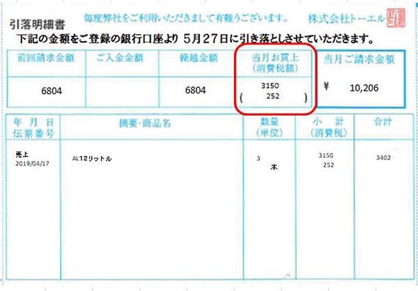 4月ご利用金額につきましては、下記の引落明細書 当月売上金額(赤枠合計金額)をご確認いただきますようお願い致します。