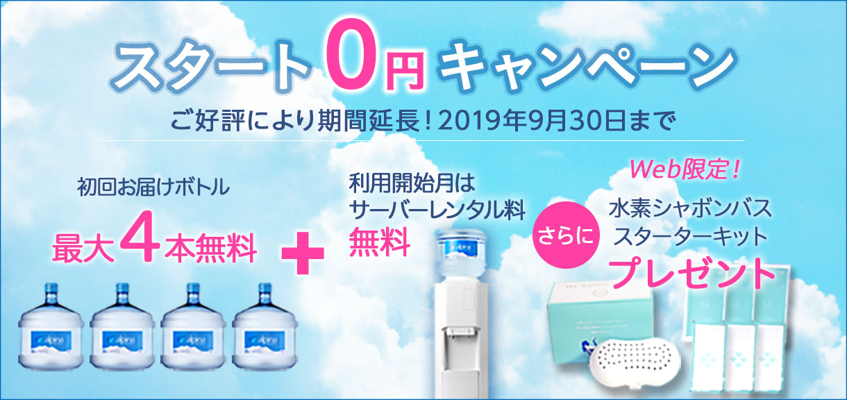 当サイトよりアルピナウォーターをお申込みで初回お届け分ボトルを無料でプレゼントするキャンペーンにつきまして、ご好評により2019年9月30日まで延長いたします。