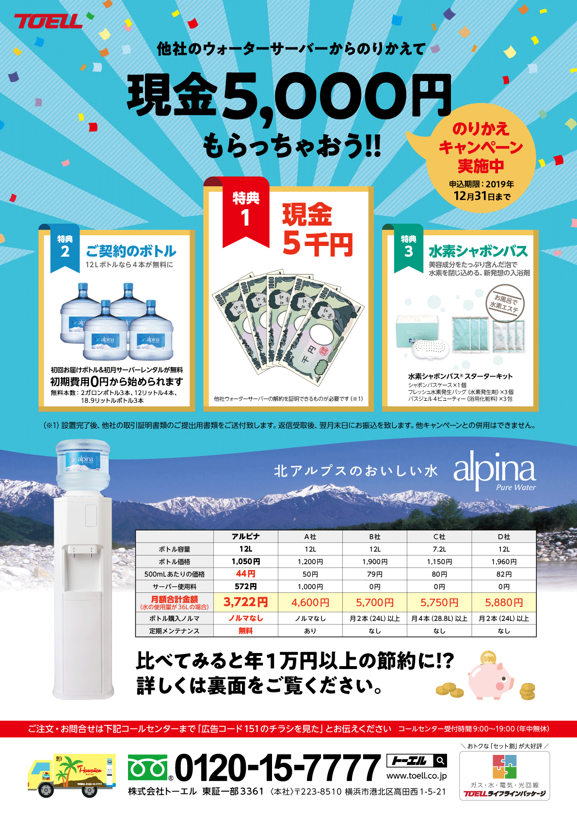 アルピナウォーターは、ご好評につき「のりかえキャンペーン」の申し込み期限を2019年12月31日まで延長いたします。