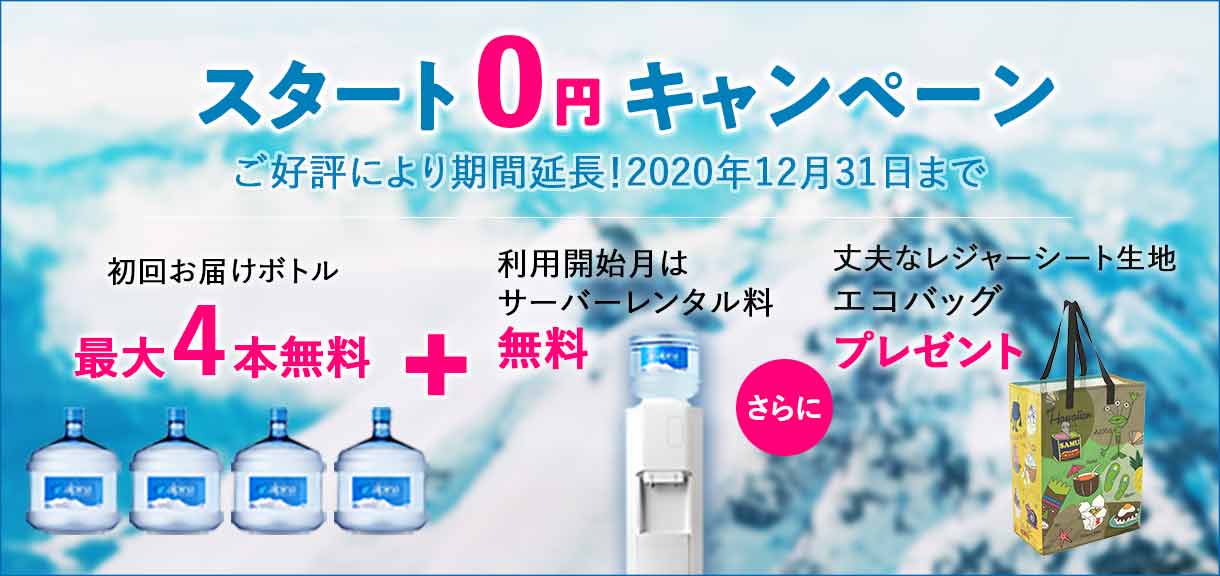 当サイトよりアルピナウォーターをお申込みで初回お届け分ボトルを無料でプレゼントするキャンペーンにつきまして、ご好評により2020年12月末日まで延長いたします。