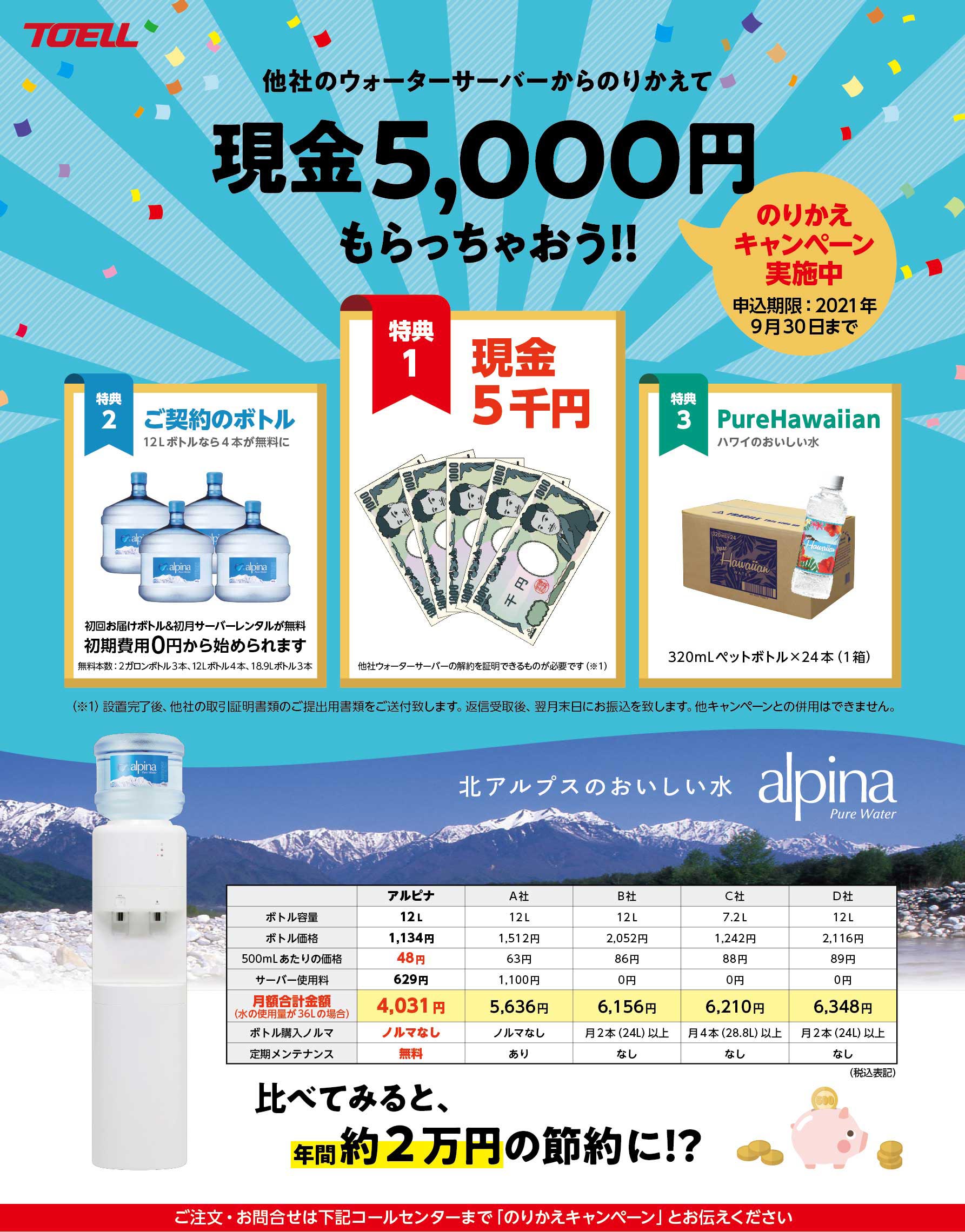 他社のウォーターサーバーをご利用中のお客様がアルピナにのりかえると、もれなく現金5,000円、初回お届け分のボトル、ピュアハワイアンペットボトル(320mL×24本)がもらえるキャンペーンです。