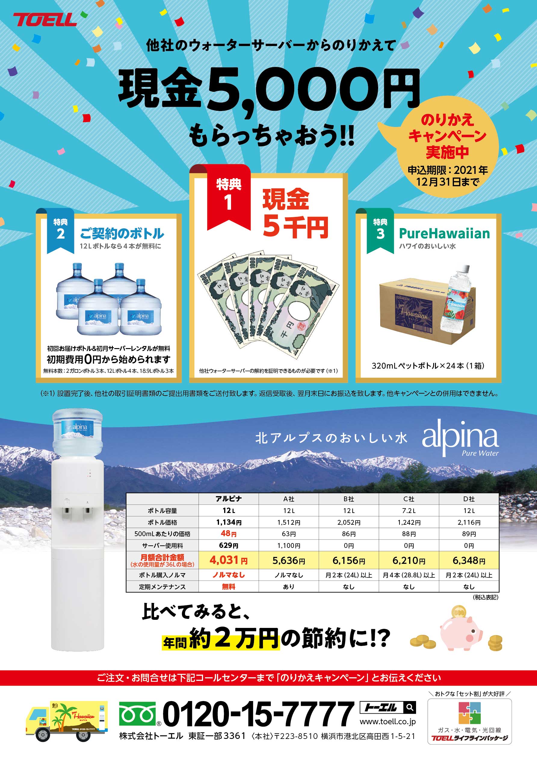 他社のウォーターサーバーをご利用中のお客様がアルピナにのりかえると、もれなく現金5,000円、初回お届け分のボトル、ピュアハワイアンペットボトル(320mL×24本)がもらえるキャンペーンです。