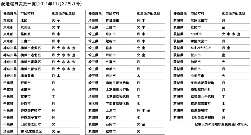変更内容:添付PDF(配送曜日変更一覧(2021年11月22日以降)をご参照ください。