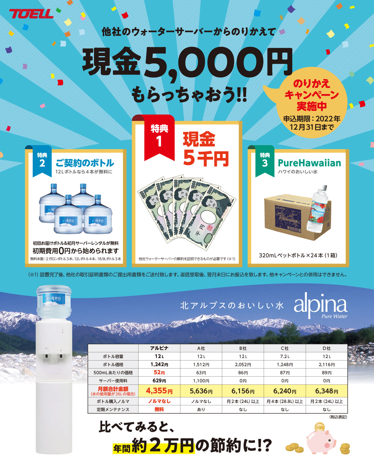 他社のウォーターサーバーをご利用中のお客様がアルピナにのりかえると、もれなく現金5,000円、初回お届け分のボトル、ピュアハワイアンペットボトル(320mL×24本)がもらえるキャンペーンです。