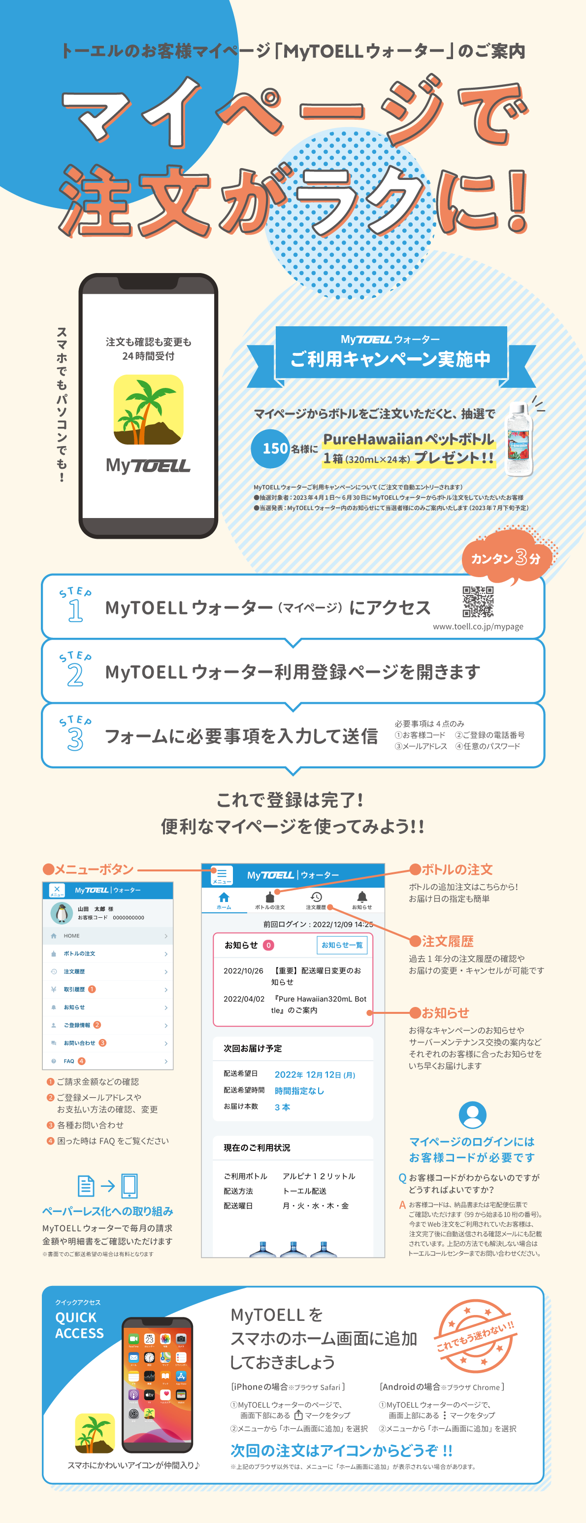 いつでも注文ができ、その他便利な機能がたくさんのMyTOELLウォーターに是非ご登録ください。