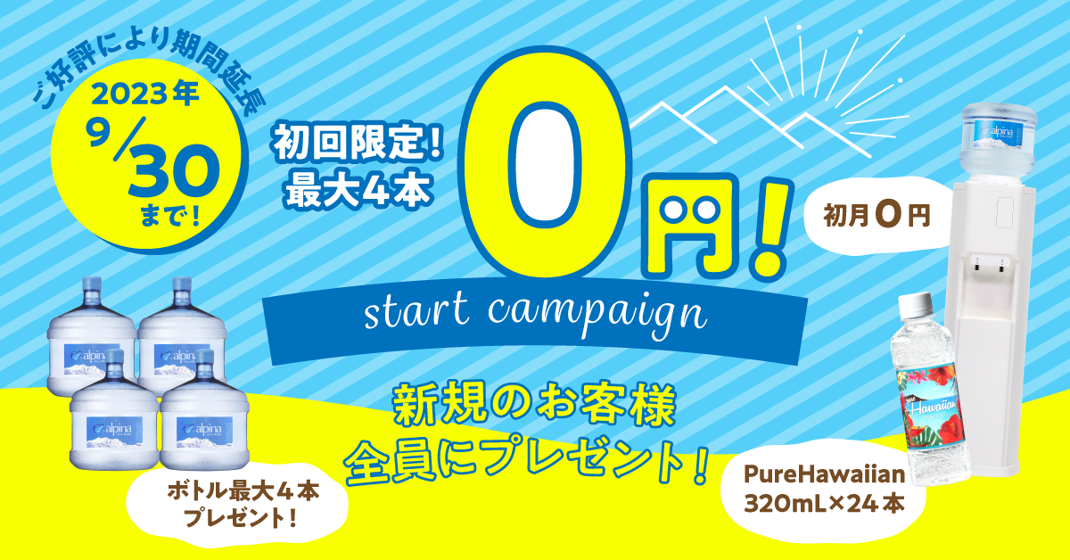 当サイトよりアルピナウォーターをお申込みで初回お届け分ボトルを無料でプレゼントするキャンペーンにつきまして、ご好評により2023年9月末日まで延長いたします。
