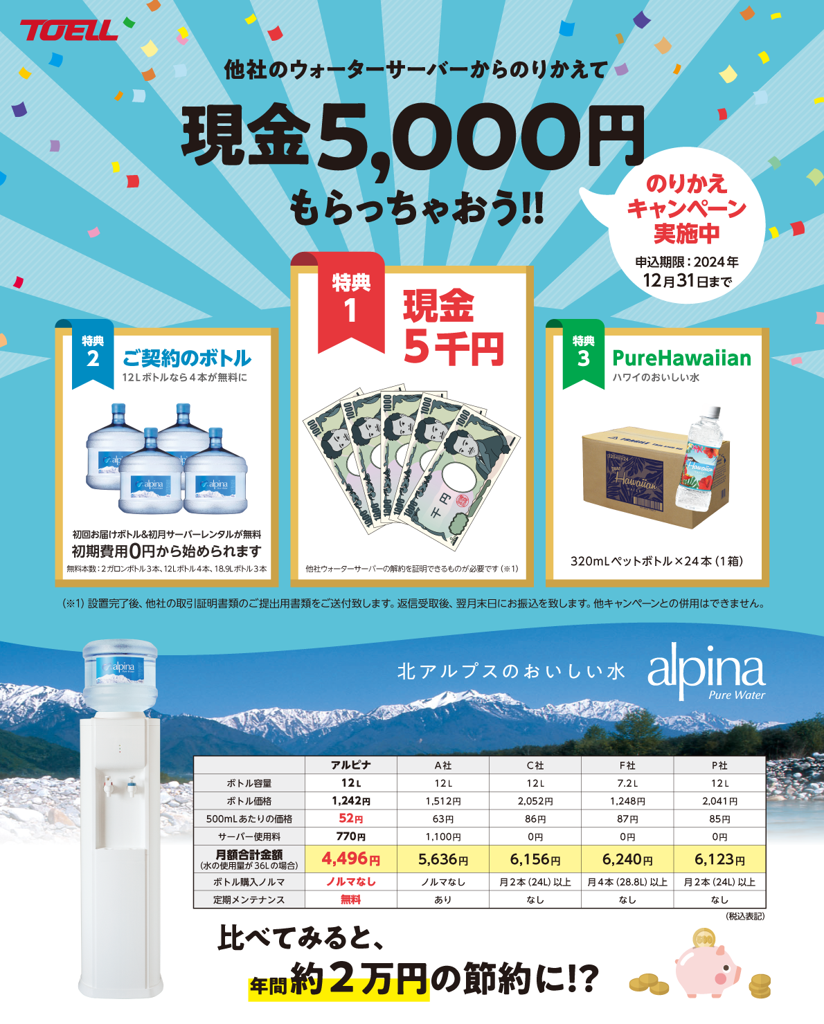 他社のウォーターサーバーをご利用中のお客様がアルピナウォーターにのりかえると、もれなく現金5,000円キャッシュバック!
