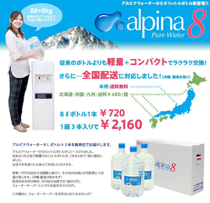 アルピナウォーターから便利な8リットルボトルをリリースしました。