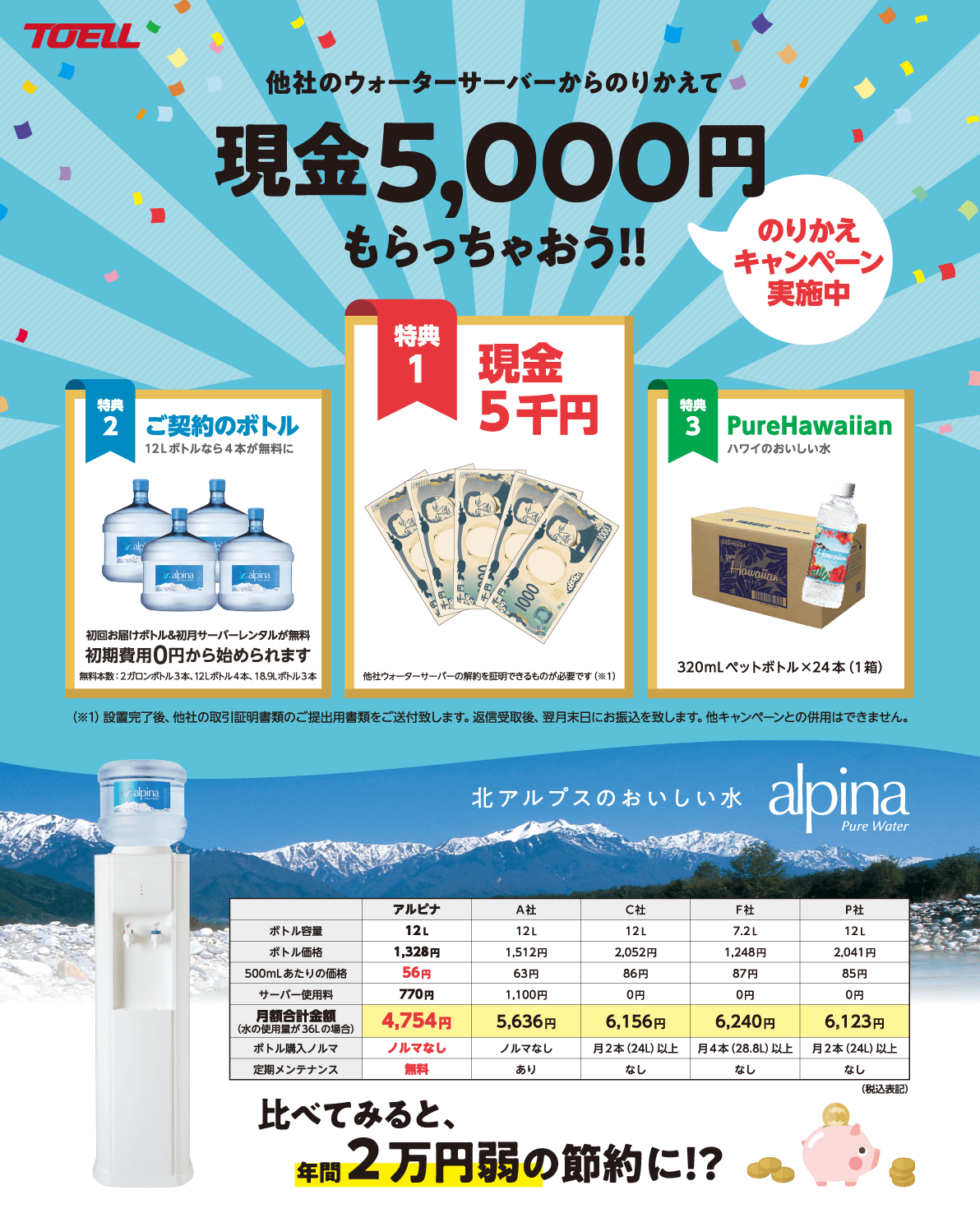 他社のウォーターサーバーをご利用中のお客様がアルピナウォーターにのりかえると、もれなく現金5,000円キャッシュバック!